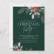 Invitación a la fiesta de los Navidades modernos, con una elegante vegetación de invierno y bayas. El fondo verde oscuro se acentúa con un texto de estilo escrito a mano de tendencia blanca.
