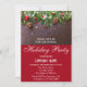 Invitación festiva anual de Navidades de empresas navideñas con ramas de árboles navideños, conos de pino y decoraciones rojas y doradas en madera oscura. Los detalles fiestas están escritos en blanco con un fondo marrón rojo brillante. Esta rústica invitación campestre es perfecta para vacaciones / Navidades / fiestas de invierno!