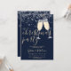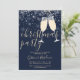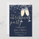 Una elegante invitación a una fiesta de Navidades con gafas de champán, copos de nieve y nombre de escritura distintivo. Esta elegante invitación puede ser personalizada con su información en letras de moda sobre un fondo azul invernal. Diseñado por Thisisnotme©