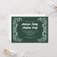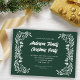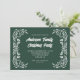 Una sencilla invitación a una fiesta familiar de Navidades con vegetación blanca a mano sobre un fondo verde forestal.