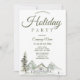 Celebre la temporada de vacaciones con nuestras invitaciones a la fiesta de Navidades corporativos de la cabina de color agua en tonos modernos de verde, marrón y blanco. Personalizar de su evento especial para crear una invitación que seguramente impresionará a sus invitados. El diseño cuenta con luces de cuerda, montañas, una cabaña rústica y un bosque cubierto de nieve. La parte trasera está diseñada con un patrón de cabaña de color agua.