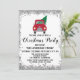 Celebra la temporada de fiestas con este festivo camión rojo con regalos y Navidades de vacaciones invitados a fiesta. Los detalles del fiesta están escritos en una tipografía de escritura negra caprichosa y audaz con un purpurina plateado que brilla el borde y el fondo blanco. ¡Esta invitación es perfecta para unas vacaciones / Navidades / fiestas de invierno!
