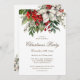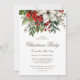 Elegante invitación a la fiesta de Navidades botánicos con poinsettia blanca, con bayas rojas y otras zonas verdes.