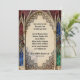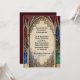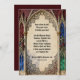 Arcos góticos, con detalles florales y de encaje, sobre un fondo rojo, azul y verde, hacen una bonita invitación a las fiestas. No tanto Navidades se orientaron a que no se pudiera usar para otras celebraciones a lo largo del año.