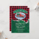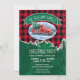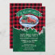 Invite a sus Navidades fiestas invitados con estilo con esta rústica invitación con tarjeta plana temática. El diseño presenta una camioneta roja vintage en una escena nevada con músculos. Arriba hay un cartel verde con el nombre de su familia y debajo de los detalles de su fiesta para que usted lo personalize. El fondo de la decoración está formado por una plancha de búfalo roja y un pinar negro. Diseñado por la artista de renombre mundial ©Tim Coffey.