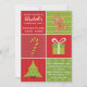 Una encantadora invitación, perfecta para una fiesta infantil con un fondo de diferentes patrones festivos en verde y rojo, con ilustraciones de un hombre de pan de jengibre, un bastón de dulces, un regalo envuelto en papel para fiestas y un árbol de Navidad. Los patrones de fondo son rayas verdes, puntos de polka rojo y blanco, rayas rojas, copos de nieve y un sutil patrón de damasco rojo. Personalizar el texto para crear tu propia invitación de la fiesta de Navidades para tus hijos.