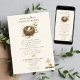 La página de un libro de cuentos sobre la naturaleza inspiró la invitación a la ducha de fiesta anidante con ilustracion de un nido de aves con huevo blanco moteado. Diseño de hongos en la parte inferior derecha.