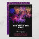 Una invitación moderna y elegante para Nochevieja que presenta fuegos artificiales coloridos sobre fondo negro y brillo púrpura en la parte posterior. Esta tarjeta de invitación colorida captura el espíritu de la Nochevieja. Perfecta para invitar a amigos y seres queridos a celebrar la Nochevieja.