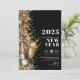 Invitación moderna de Año Nuevo a una fiesta de champán negro y dorado. Celebre con estilo con esta elegante invitación de Año Nuevo! Con llamativas ilustraciones de fuegos artificiales negros y dorados, una botella de champán y una copa en el lado izquierdo, este diseño crea una apariencia festiva y sofisticada. El fondo negro resalta las fuentes serif blancas y en negrita en el lado derecho para un diseño nítido y clásico. La parte trasera se deja en negro plano para un acabado minimalista. Todos los colores, incluyendo el fondo, son totalmente personalizables para adaptarse al tema de su evento. Perfecta para una celebración chic de Año Nuevo, cuenta regresiva de medianoche o reunión elegante con amigos, esta invitación establece el tono para una noche inolvidable de festividades.