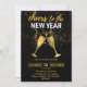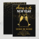 Brinde y celebre con estilo con esta elegante invitación a la fiesta de Nochevieja que presenta un fondo negro elegante, confeti dorado brillante y copas de champán con brillo en un brindis de celebración. Perfecto para reuniones de Año Nuevo con clase, fiestas de cóctel, eventos de cena y celebraciones de medianoche.
