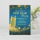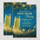 Invitación elegante de Año Nuevo en dorado y azul: diseño personalizado con champán y brillo