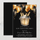 Una invitación moderna de acuarela para Nochevieja, con globos dorados y negros y un cubo de champán, sobre fondo negro. Sencilla elegancia moderna. Adecuado para cualquier año.
