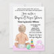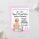Invitación de fiesta de pañales y toallitas para bebé con una adorable niña con juguetes sobre un fondo de lunares rosados adorable.