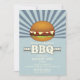 Invitación a la barbacoa con rayas azules radiales con una gran hamburguesa colocada en la parte trasera azul y con un toque especial. Perfecto para una barbacoa de verano, un fiesta de día conmemorativo, cocina del 4 de julio, fiesta del día laboral, reunión familiar o una piscina de verano y fiesta barbacoa.