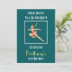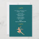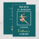 Una invitación de fiesta de patinaje art déco retro. Una imagen vintage de estilo retro de una patinadora artística femenina. Vestida con un elegante y sedoso traje de patinaje artístico de color rosa coral. Con patines rosa coral a juego y guantes largos y elegantes. Su larga cola de caballo marrón se balancea en el aire mientras salta alto, en una pose clásica de patinadora artística. La ilustración está ambientada sobre un fondo verde bosque oscuro. Personalice con todos los detalles de su fiesta en la parte delantera y trasera.