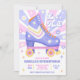 Un divertido y luminoso diseño de patines de estilo retro en la paleta de colores rosa pastel, naranja, morado y amarillo. En la parte delantera hay un patín de rodillos morados y el texto 'Vamos a correr' en un guión retro con una ráfaga de sol detrás, y en la parte trasera hay un divertido y brillante patrón de patines. Personalizar los detalles para su fiesta! Vea toda la colección de fiestas coincidentes.