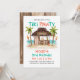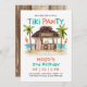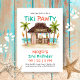 Celebre el cumpleaños de su cachorro o una ocasión especial con esta invitación de fiesta de perro con tema de playa tropical "Tiki Pawty". Con una cabaña tiki en la playa llamada "Tiki Mutt", un fondo de océano turquesa, palmeras, tabla de surf, antorchas tiki, juguetes de pelota y huesos. Perfecto para un cumpleaños de perro, día de juego de mascotas o fiesta de piscina de verano. Arte por KL Stock.