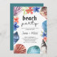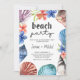 Invitación de Engagement Beach Party, enmarcada con conchas acuáticas y flores tropicales. el fiesta de playa está escrito a mano y el resto de la redacción es totalmente editable.