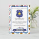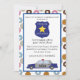 Esta invitación de fiesta personalizada tiene un tema de oficial de policía. El fondo presenta un patrón de baldosas de donas glaseadas coloridas. Una insignia de oficial se imprime en la parte superior con un nombre de oficial de muestra que puede personalizar para incluir su propio nombre o texto personalizado. Un carro de policía azul o automóvil patrullero se imprime en la parte inferior, debajo de la información de la fiesta. Es perfecto para su próximo cumpleaños, fiesta de jubilación u otra celebración con tema policial.