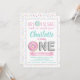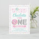 Invitaciones para fiestas de primer cumpleaños con donuts de color agua rociada y letras de globo de Relieve metalizado plateado sobre un fondo pastel rociado. Esta adorable rociada de rociar la primera invitación de cumpleaños se personaliza fácilmente con tus detalles.