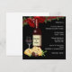 Una hermosa y minimalista ilustración de una botella de vino tinto que tiene el tema de su evento; una copa de vino tinto; rodajas de queso Edam; trufas de chocolate exóticas y ramitas de romero bordeando el borde izquierdo y una guirnalda de flores de bayas con un lazo rojo de seda falsa suave encima.