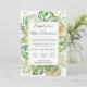 Esta elegante invitación de recepción de fuga tropical presenta hojas de palma, filodendro y helecho en verde y dorado. Un elegante marco dorado resalta el texto en verde oscuro. Las salpicaduras doradas acentúan este diseño botánico exótico y aportan un toque de fantasía moderna a la invitación. "Celebración Feliz para Siempre" junto con los nombres de la novia y el novio aparecen en la parte superior. Los detalles del voto matrimonial y la ubicación y fecha de la recepción están detallados en la parte frontal. La información de RSVP está en el reverso de la invitación.