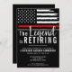 Este diseño cuenta con una bandera de los bomberos con rayas blancas y negras y una delgada franja de línea roja. El texto de "La leyenda es agotadora" se encuentra sobre todos los detalles del fiesta para el bombero, teniente o jefe que se retira.