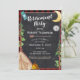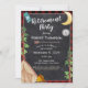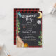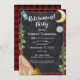 Senderismo, acampada o glamping, invitación de manto de búfalo rojo y negro con un diseño de camping tipo tiza de media luna, pinos, brújula, mochila, tienda de campaña y fogata. Se puede personalizar una invitación rústica y externa a la fiesta de retiro con tu propio texto y estilos de fuente.