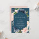 Esta invitación a una soltera azul cielo y flores navales es perfecta para un evento floral. El diseño es clásico y elegante, con un fondo azul verde azulado, y está decorado con un acuarela de color azul marino moderno y flores rosas rubias. Personaliza la parte trasera de la tarjeta con el nombre del invitado de honor y el evento.