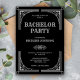 Invite a tus invitados con esta invitación de fiesta de soltero con tema vintage de El Gran Gatsby que presenta un borde decorativo plateado con tipografía elegante sobre un fondo negro. Simplemente agregue los detalles de su evento en esta plantilla fácil de usar para hacer que sea una invitación única. Voltee la tarjeta para revelar un hermoso patrón de estrellas plateadas en la parte posterior de la tarjeta.