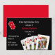 Invitación a la fiesta de soltero realizada en negro y rojo con un tema de póquer. Gráficos de fichas de póquer rojas y cartas de juego decoran la invitación negra. Personaliza todo el texto para tu fiesta de soltero.