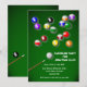Una invitación perfecta para cualquier fiesta de billar. La tarjeta es fácil de personalizar con su texto, fuente, color de fuente, opciones de forma de papel y elección de seis tipos de papel.