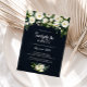 Esta invitación blanca y floral a la fiesta sorpresa de la realeza azul verde es perfecta para un cumpleaños rústico, jubilación o cualquier fiesta sorpresa. El diseño presenta elegantes peonías blancas acuarelas con follaje verde en un fondo azul oscuro.