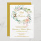 Con una delicada guirnalda floral de acuarela, esta elegante invitación botánica de sorpresa para el 50 aniversario de boda se puede personalizar con la información de su aniversario especial. El reverso presenta una guirnalda floral a juego que enmarca las fechas de su aniversario en texto elegante sobre un fondo dorado. Diseñado por Thisisnotme©