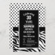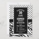 Una invitación sorpresa de cumpleaños 30 en blanco y negro con puntos de polka y rayas de cebra.