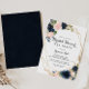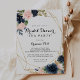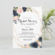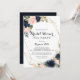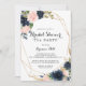 Esta invitación a una fiesta de té con ducha de novia geométrica dorada y floral es perfecta para una ducha de boda moderna. El diseño se compone de bonitos azules oscuros pintados a mano, azules, marinos, rosados, ondulados, flores doradas y follaje verde, repartidos en elegantes ramos.