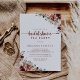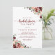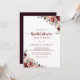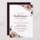 Esta rústica invitación a hacer una fiesta de verano con flores en la ducha de novia es perfecta para una simple ducha de boda. El diseño se compone de flores de color burdeos, rosa y azul con hojas verdes en un fondo manchado de color marrón.