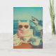 Un gato fresco con gafas de sol rosas y una bufanda disfruta del té en una mesa de playa mientras un tiburón dramático salta del océano al fondo.