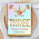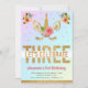 Sorprenda a sus huéspedes con esta encantadora invitación a una fiesta de cumpleaños temática unicornio con una hermosa cara de unicornio dorado y flores de bonito con tipografía moderna sobre un fondo degradado de arcoiris pastel. Simplemente agregue los detalles de su evento en esta plantilla fácil de usar para convertirla en una invitación única. Girar la carta para revelar un patrón falso de rayas purpurinas de oro en la parte posterior de la tarjeta.