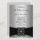 Elegantes invitaciones modernas de color negro con damasco plateado para la fiesta del 25 aniversario de boda.