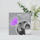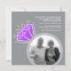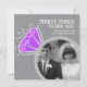 Invite a sus amigos y familiares a una fiesta especial de aniversario de bodas de amatista o celebración de cena con estos anillos gráficos de eternidad con destellos grises, púrpura amatista y blancos, y dos fotos de entonces y ahora. Personalizados con sus propias fotos del día de la boda de la pareja y una foto actual en el reverso, luego agregue sus propias palabras de celebración, fecha de la fiesta y lugar. Otros artículos coincidentes están disponibles. Arte y diseño gráfico del anillo original por www.mylittleeden.com en Zazzle.