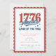 Esta invitación para la fiesta del 4 de julio presenta un gráfico patriótico de 1776 en rojo y azul. Hay un borde rojo con festones alrededor del borde. Puedes personalizarlo con los detalles de tu evento.