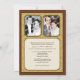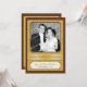 Celebre a esa pareja especial con esta invitación para una fiesta de aniversario de bodas de oro. Su foto está en un fondo con estampado de damasco dorado con un borde de color burdeos oscuro. (Asegúrese de sustituir una foto grande y de alta resolución para esta imagen frontal). Sus nombres y fecha de bodas (o cualquier otro texto) se resaltan en la placa debajo. Luego, muéstrelos como eran entonces y como son ahora en la parte trasera con toda la información del evento a continuación. Productos coincidentes disponibles.