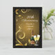 Invitación de aniversario rica y elegante para 50 años o cualquier año. Las hermosas y festivas invitaciones presentan un diseño negro y dorado con un patrón de remolino elegante y dos copas de champán burbujeante con una botella de champán con tinte verde para celebrar el gran día de los invitados de honor.