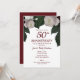 Invitación de Rosas Blancas para Fiesta de 50 Aniversario. Diseñada con racimos de rosas blancas y follaje sobre un fondo blanco con texto en color burdeos intenso. El texto incluye: Se Solicita su Presencia en la Celebración del, 50 Aniversario de Bodas, en Honor a, el Nombre de la Pareja, La Fecha, Hora, Lugar, Dirección y Contacto de RSVP. El reverso tiene un fondo burdeos intenso a juego. Para personalizar, simplemente inserte sus datos en nuestra fácil plantilla, reemplazando el texto de muestra. Asegúrese de ver las tarjetas y accesorios a juego.