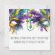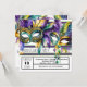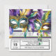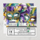 Dos máscaras de máscaras malvas violetas, doradas, verdes y azules con perlas de Mardi Gras adornan el frente de esta invitación al personalizable. Añade a tu fiesta información y fecha, ubicación y lo que se sirve en la parte delantera de esta tarjeta. El reverso de la tarjeta deja espacio para información adicional para sus huéspedes y cuenta con una máscara de mascarada de Mardi Gras diferente y única. ¡Disfruten de la temporada de carnaval! ¡Estar bien!