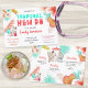 Una colorida mezcla de cócteles, flores, hojas y chicas divirtiéndose para que tus amigos sepan exactamente lo que se puede esperar de tu playa tropical Hen Fiesta fin de semana cuando reciben esta vibrante invitación en tonos de coral, tés, rojo y verde. La tipografía de cabecera se encuentra en un tipo de letra marty de verano ajustado a la ocasión y el resto del texto se personaliza fácilmente en ambos lados, con los detalles de la invitación en el itinerario delantero y de fin de semana en la parte posterior. También puede cambiar los colores, tamaños y estilos de las fuentes del texto modificable a través de la opción Click to Personalizar Más adelante si sus palabras necesitan ajustarse para ajustarse.