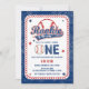 El diseño de la fiesta de primer cumpleaños del niño con el tema afligido del béisbol "Rookie del año". Presenta el texto "Rookie del año" con tema de béisbol, con un béisbol parado en la "O" en "One" junto con el pellejo de béisbol alrededor del marco rectangular redondeado. La parte posterior presenta un fondo rayado rojo y blanco angustiado.