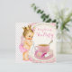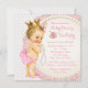 Invitación para baby shower de té para niñas con una adorable bebé princesa de color rosa que lleva pantalones de volantes rosados, collar de perlas y una hermosa corona dorada y rosa. Esta adorable invitación para baby shower de té con taza de té de princesa de perlas rosadas se personaliza fácilmente para su evento agregando los detalles del evento, estilo de letra, tamaño y color de la letra, y redacción.