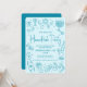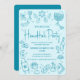 Feliz Janucá.” Este año, es hora de reunirse con familiares y amigos para celebrar Janucá y dar la bienvenida al festival de las luces. Divertida y caprichosa tipografía manuscrita azul turquesa sofisticada e ilustraciones de iconos de Janucá caprichosos dibujados a mano se superponen en un fondo azul turquesa pálido. Adornos blancos adicionales dibujados a mano en azul turquesa adornan la parte posterior. Siente el calor y la alegría de la temporada navideña cuando envíes esta divertida, juguetona, moderna y personalizada invitación de fiesta de Janucá. ¡Haz que este Janucá sea inolvidable!